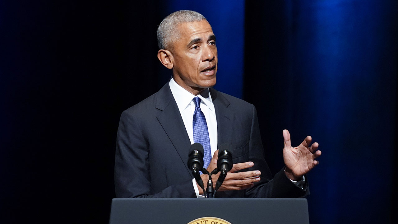 Former President Barack Obama speaks during a memorial service for former Senate Majority Leader Harry Reid at the Smith Center in Las Vegas, Saturday, Jan. 8, 2022. (AP Photo/John Locher)